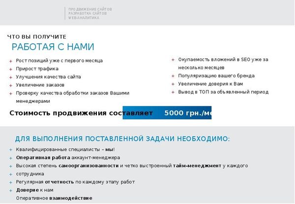 - не расхваливайте компанию, описывая ее достоинства, а описывайте результат после работы с вами, давайте основную информацию;
