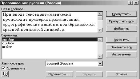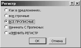 Часто встречающаяся ошибка ввода текста прописными буквами может быть легко исправлена с помощью команды Формат/Регистр, которая вызывает диалоговое окно Регистр (рис. 5.2).