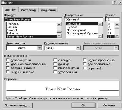 Выбирая гарнитуру шрифта, следует раскрыть список Шрифт на панели инструментов Форматирование. Шрифты типа Times Roman обычно используются в документах, а курсивные – в поздравительных адресах. Размер шрифта измеряется в пунктах (72 пункта составляют 1 дюйм). Для новых документов, создаваемых на основе шаблона Обычный, по умолчанию установлен шрифт Times New Roman размером в 12 пунктов. Для документов, передаваемых факсимильными аппаратами, следует использовать шрифт размером 14 пунктов. Изменение размера шрифта производится через раскрывающийся список Размер панели Форматирование, причём можно задавать также и произвольные размеры, например, 13 или 15.