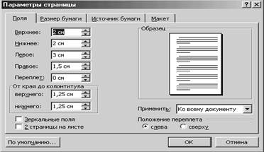 По умолчанию левое и правое поля страницы устанавливаются с размерами 3 и 1,5 см, а верхнее и нижнее поля – с размером 2 см. При желании их можно изменить командой Файл/Параметры страницы вкладка Поля (рис. 5.6).