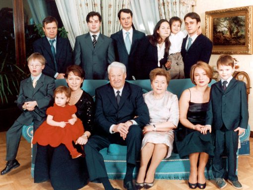 1. Борис Николаевич и Наина Иосифовна (фото 2005 года), 2. Елена Окулова (домохозяйка) с сыном Иваном, 3. Валерий Окулов, муж Елены. Экс-замминистра транспорта, 4. Старшая дочь Елены Окуловой от одноклассника Сергея Феофилова Екатерина с двумя Сашами — сыном и мужем, 5. Любимый внук Ельцина — Борис. Открыл детский сад для детей олигархов, 6. Валентин Юмашев, муж дочери ЕЛЬЦИНЫХ Татьяны Дьяченко. В настоящее время девелопер, 7. Татьяна Дьяченко с дочкой Машей, сейчас девелопер и глава Фонда Бориса Ельцина, 8. Глеб Дьяченко, сын Татьяны от второго брака. В 2015 году на чемпионате Европы по плаванию среди людей с нарушенным интеллектом (у него синдром Дауна) пришел первым на дистанции 200 метров. Фото с сайта yeltsin.ru