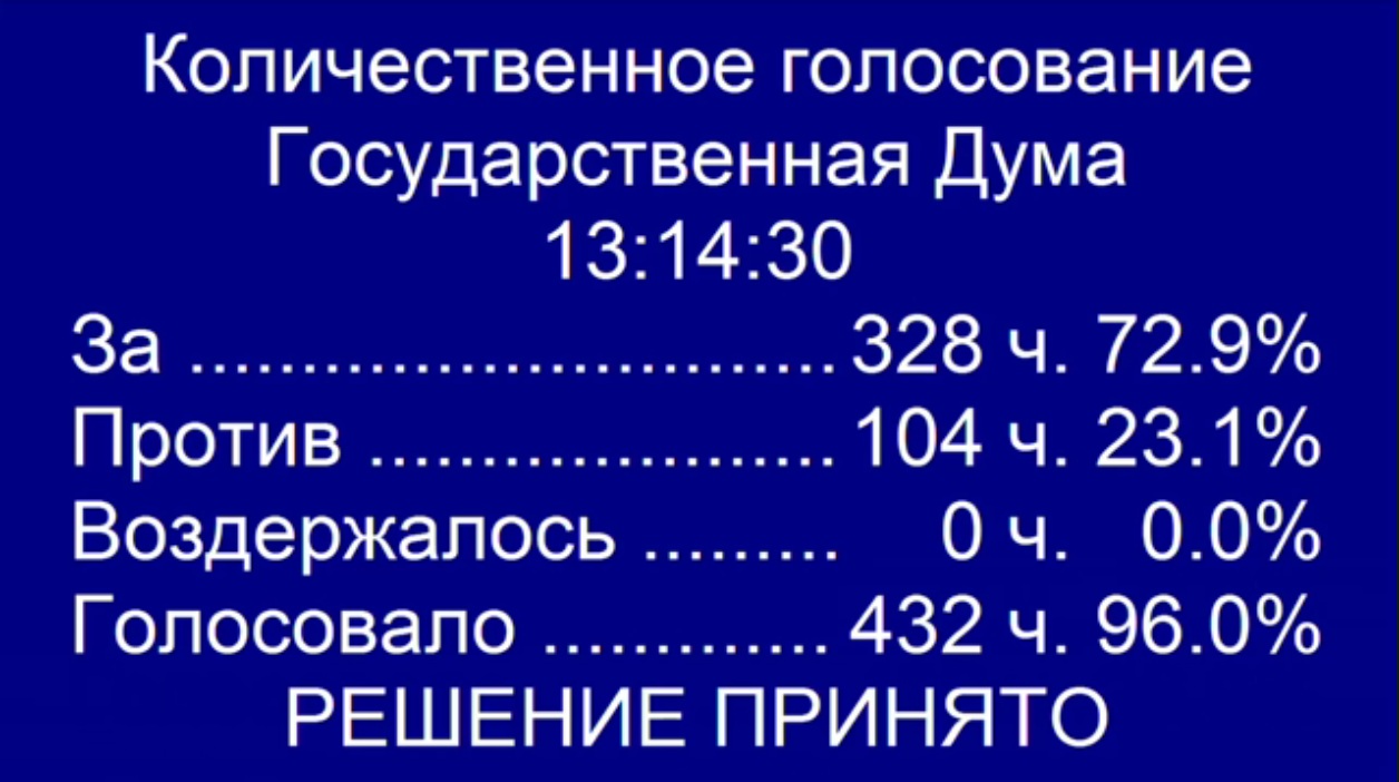 Не было никаких сомнений, что законопроект в первом чтении будет принят. Так и случилось. «За» проголосовали 327 депутатов (единороссы), «против» — 102 (коммунисты, ЛДПР, «Справедливая Россия»), «воздержался» — 1.