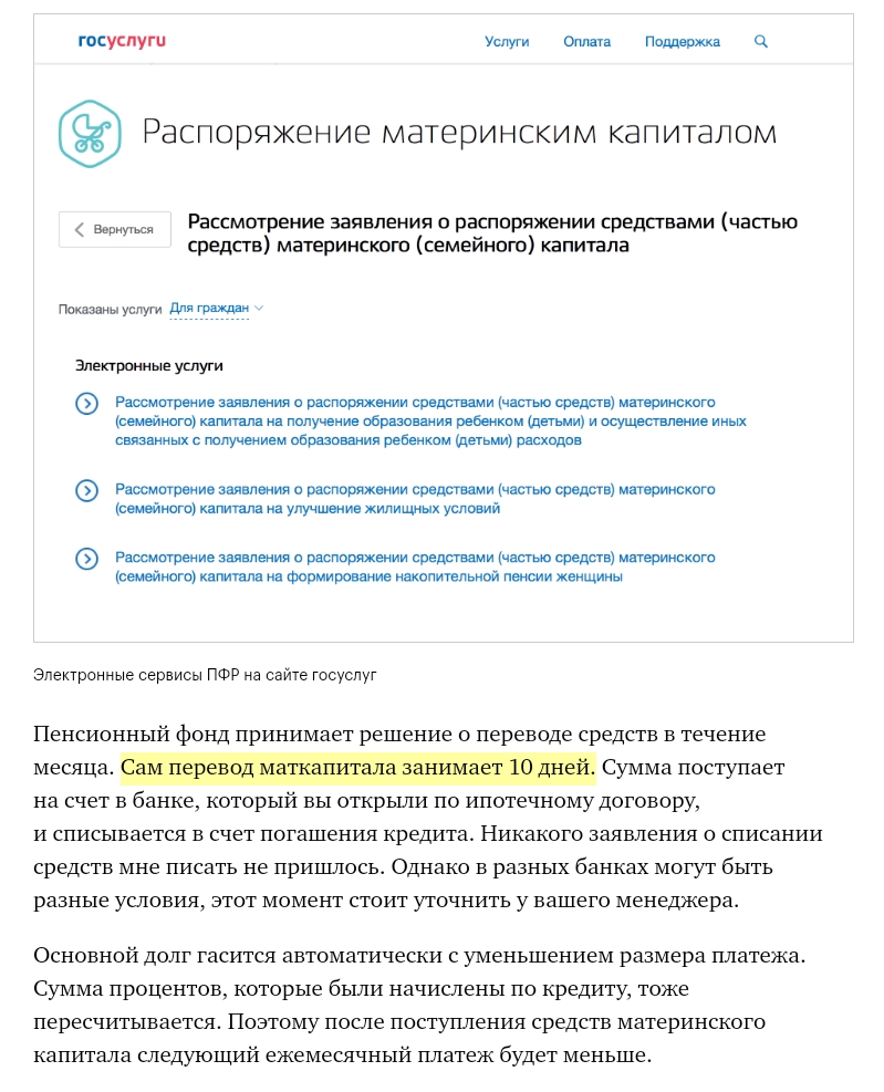 - ПФР рассматривает заявления и в случае одобрения переводит деньги на банковский счет. В среднем вся процедура занимает 1.5-2 месяца, в период которых семья по прежнему обязана оплачивать кредит в полной мере, не нарушая графика платежей. Отказ от уплаты может привести к отклонению заявки ПФР и начислению штрафов.