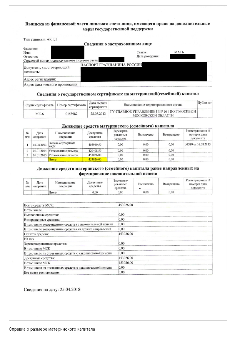 - Не дожидаясь достижения ребенком трехлетнего возраста, владелец сертификата берет в банке справку о текущей задолженности, собирает весь пакет документов для ПФР и подает заявку на распоряжение средствами.