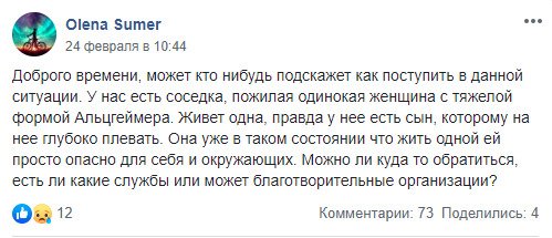 "Может кто-нибудь подскажет, как поступить в данной ситуации. У нас есть соседка, пожилая одинокая женщина с тяжелой формой Альцгеймера. Живет одна, правда у нее есть сын, которому на нее глубоко плевать. Она уже в таком состоянии, что жить одной ей просто опасно для себя и окружающих. Можно ли куда-то обратиться, есть ли какие службы или может благотворительные организации?".