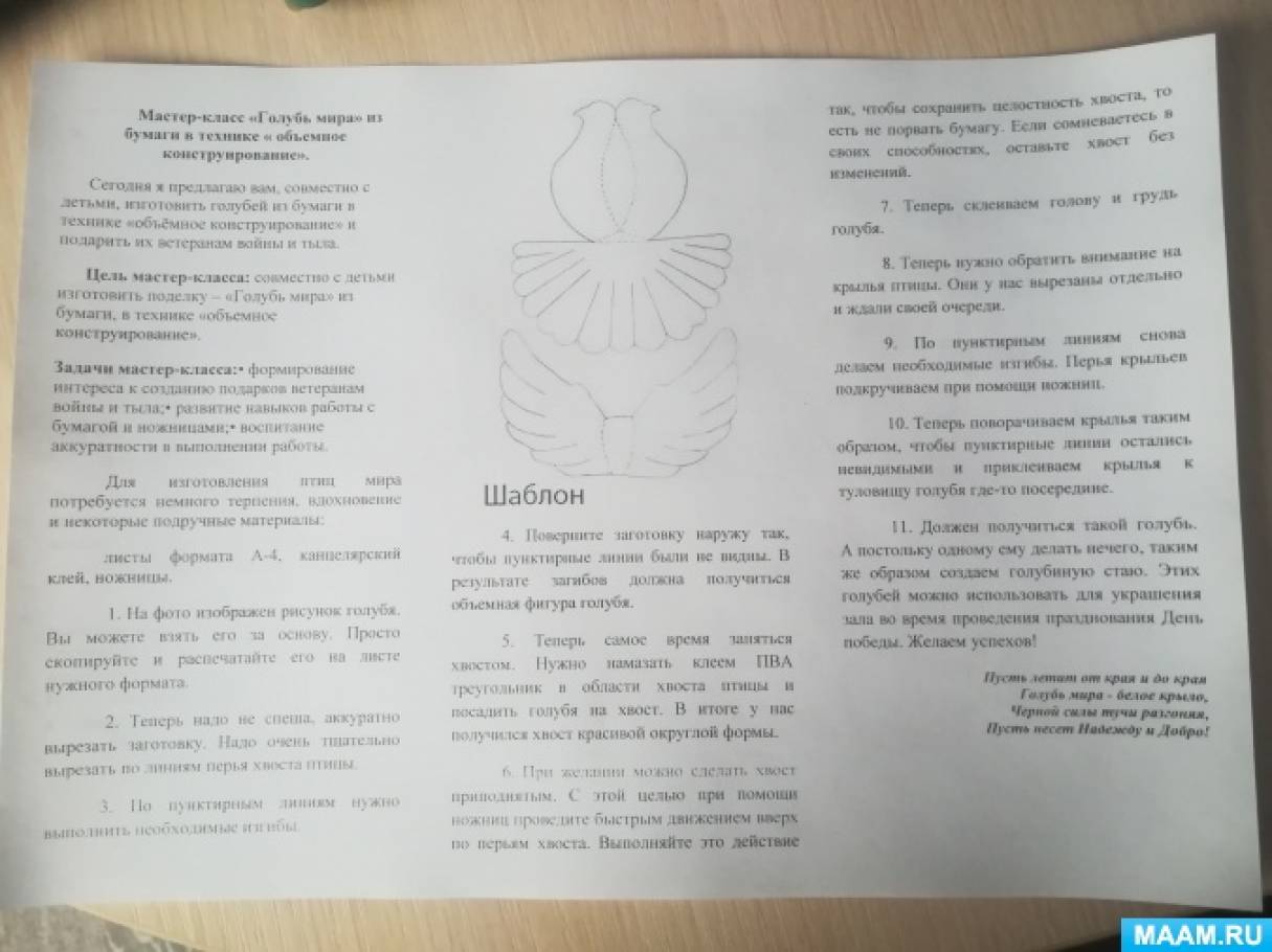Мастер-класс «Голубь мира» из бумаги в технике «объемное конструирование».