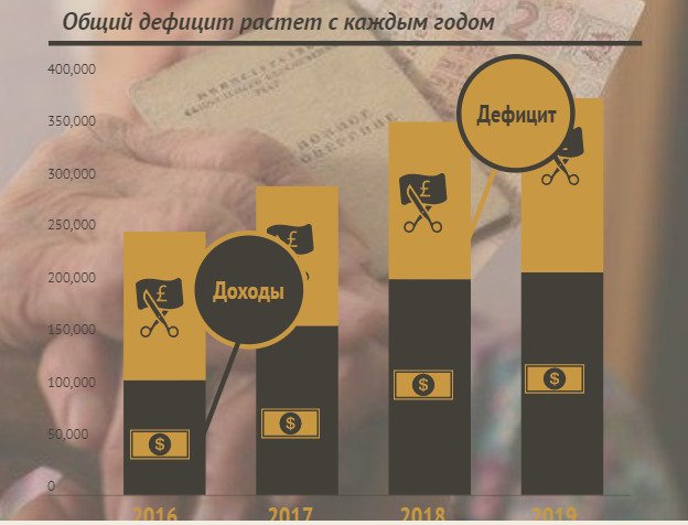 І проблема тільки загострюється. Так, як видно на графіку, ще в минулому році дефіцит становив 150 млрд грн, а у 2017-му — 139 млрд. Прем'єр-міністр Володимир Гройсман після проведення пенсійної реформи заявляв, що дефіцит можна повністю ліквідувати за 7 років. При цьому, кажучи "про дірку", він згадував "брудну цифру"