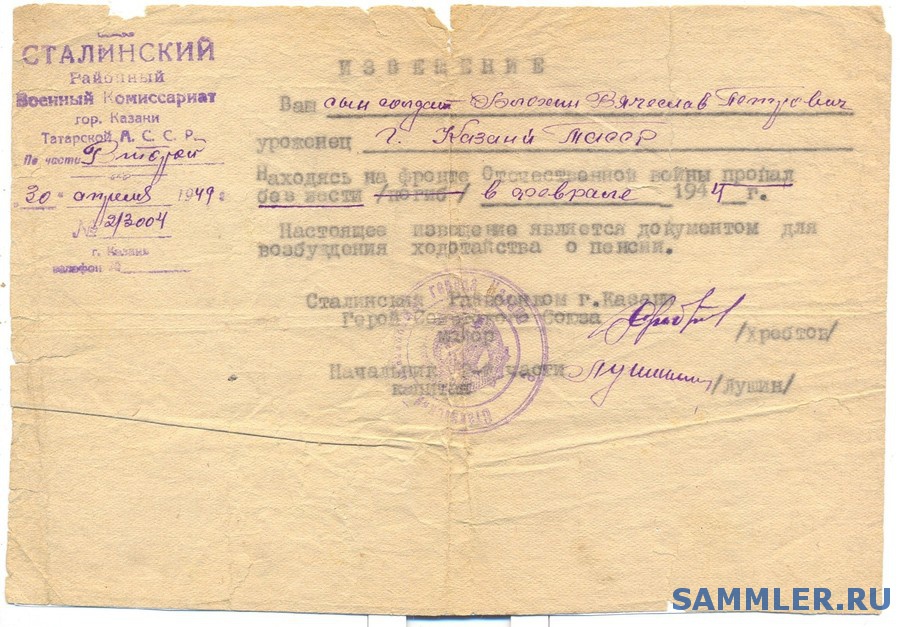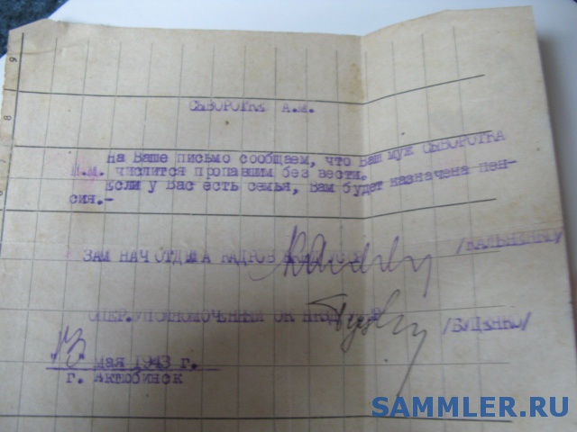 Здесь пенсию жена получала. Считался пропавшим без вести: