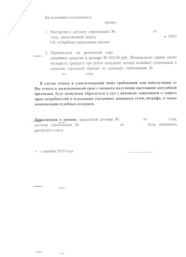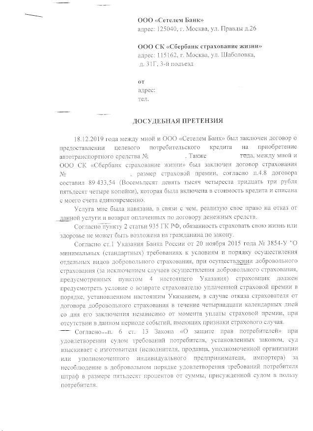 Юрист пишет мне досудебную претензию, к ней прикладывается копия всех документов (копия кредитного договора, копия договора страхования, реквизиты моего счета) и все это, опять же заказным письмом с описью вложения, отправляется теперь по Московскому адресу «СК Сбербанк Страхование Жизни» и в «СЕТЕЛЕМ» (опять же по юридическому адресу: 125040, г. Москва, ул. Правды, д. 26). Юрист сказал, что письмо в банк тоже необходимо, чтобы он знал о расторжении договора страхования и не мог предъявлять претензии, что ты их обманываешь (помним о разнице в процентах по кредиту со страховкой и без нее).