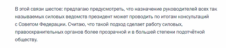 Владимир Путин:«Сейчас Президент лишь получает согласие на назначение Председателя Правительства, а назначает сам. Предлагаю изменить порядок назначения: парламент предлагает кандидатуру, а Президент не имеет права отклонить предложенную кандидатуру на посты премьера и министров»