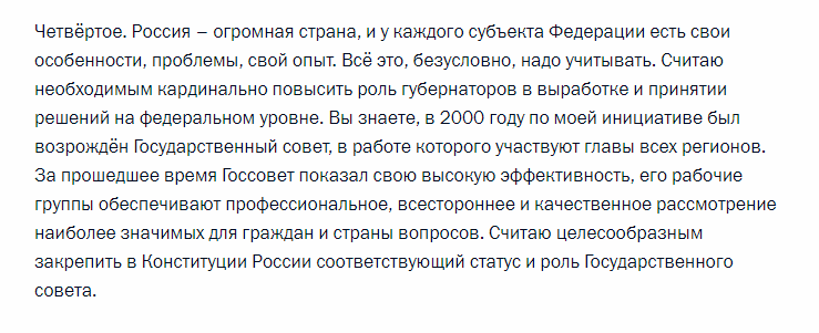 Скриншот стенограммы Послания президента России Федеральному собранию 15 января 2020 года с официального сайта президента РФ.