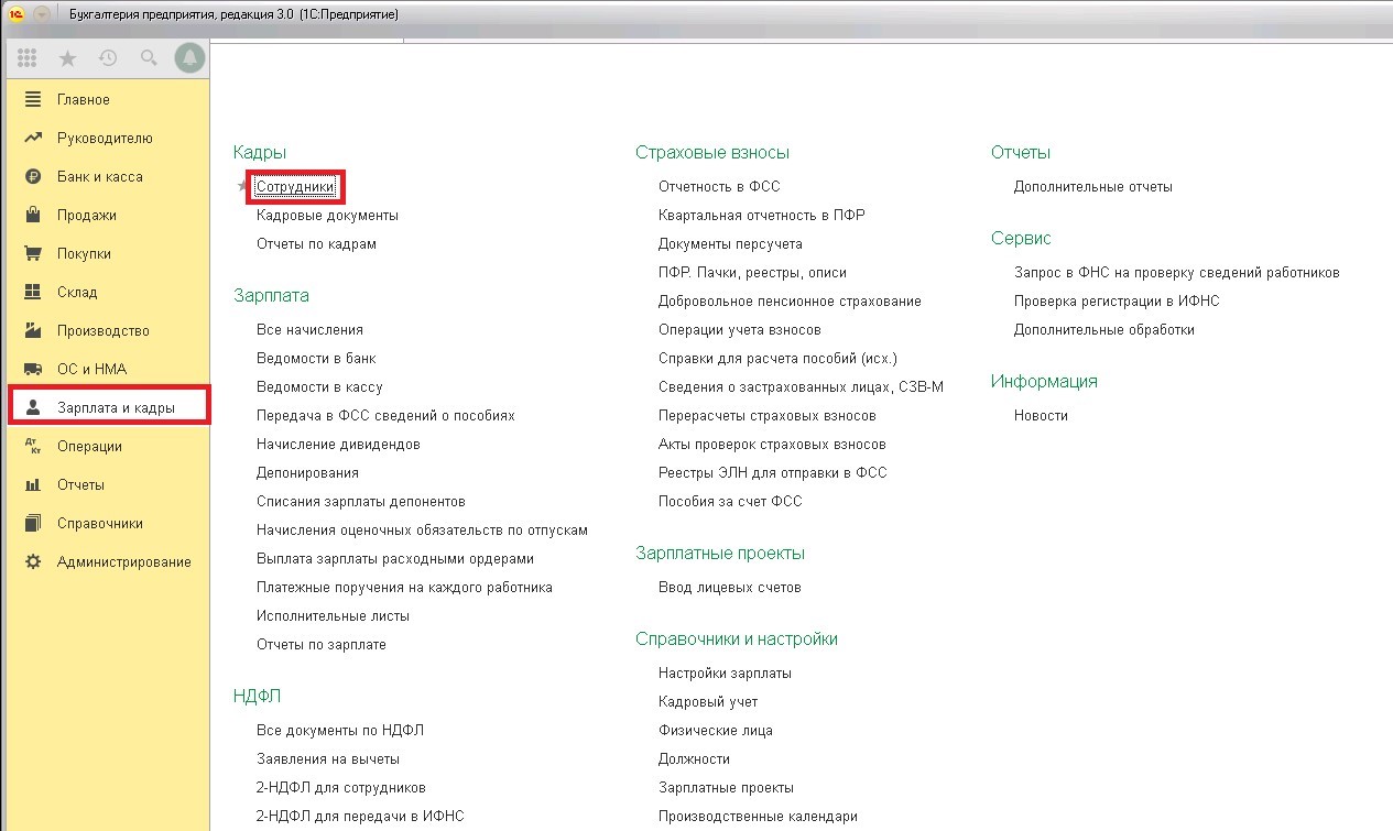Для тех, кто пользуется полным интерфейсом, слева в меню «Зарплата и кадры» нужно выбрать подпункт «Сотрудники».