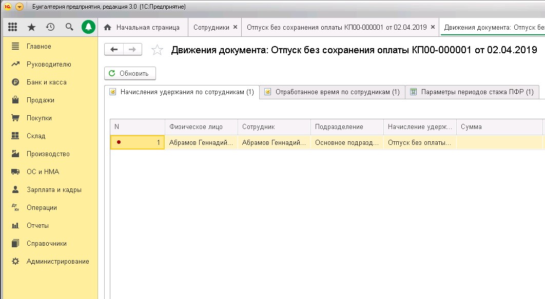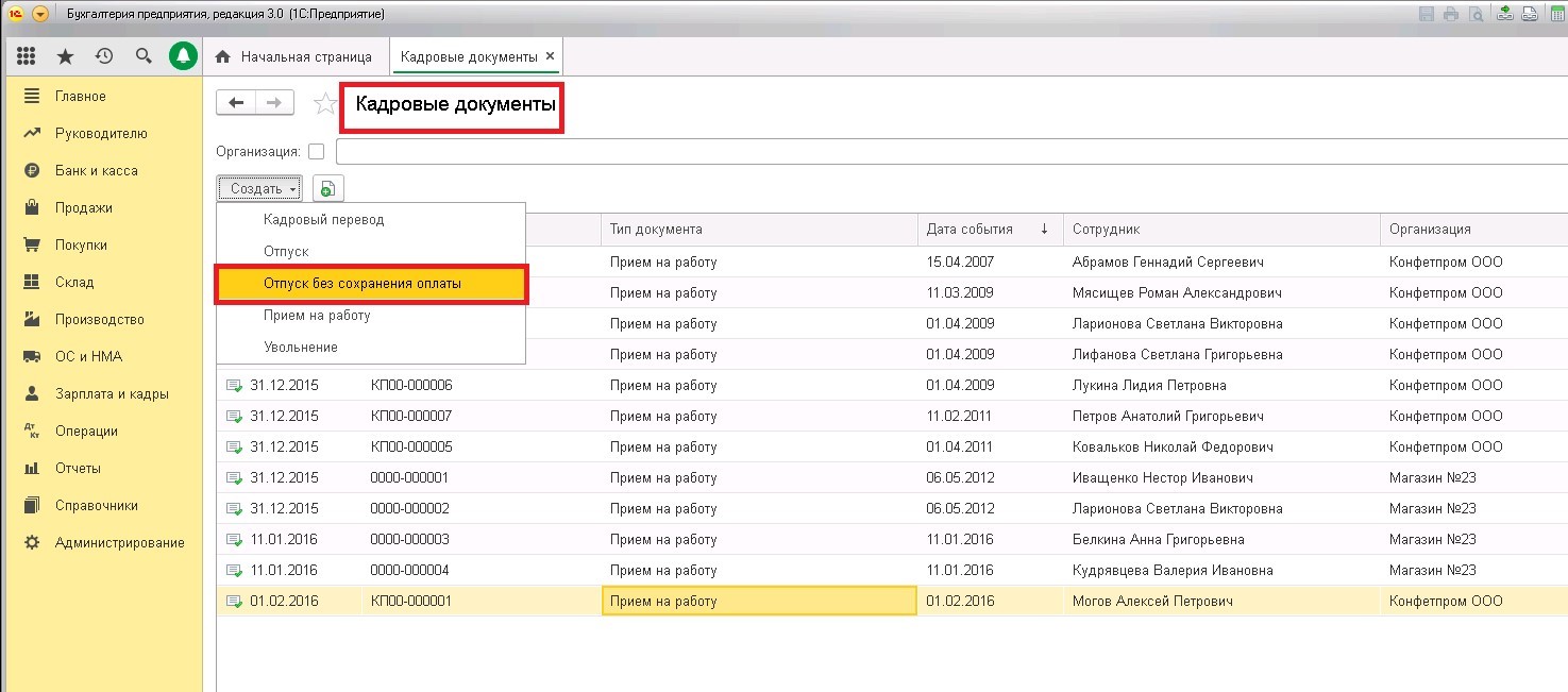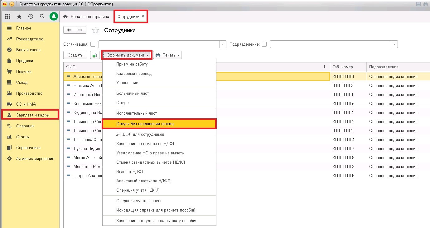 1. Оформление неоплачиваемого отпуска в 1С в Бухгалтерия предприятия 3