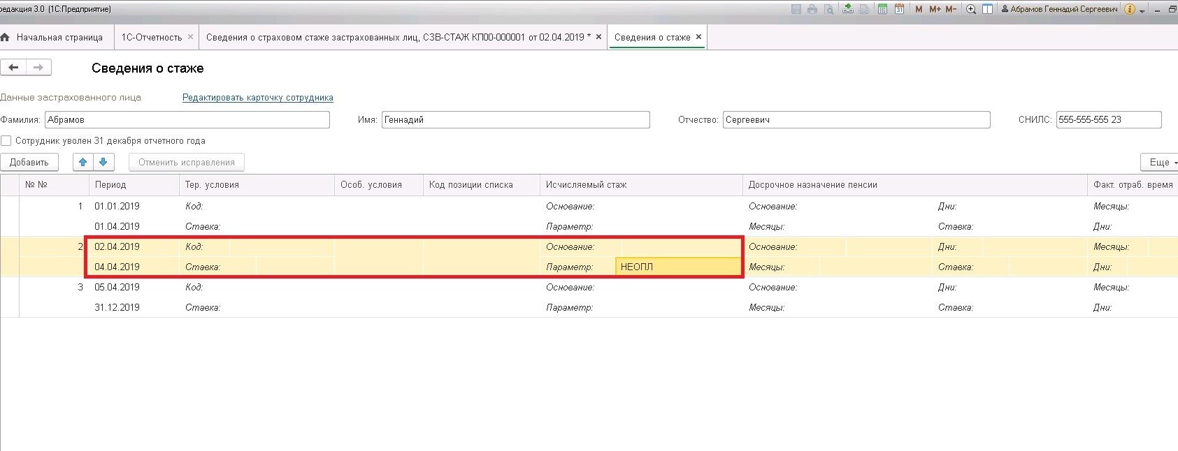 Такое отображение применяется только в случае полных дней отпуска без оплаты. При внутрисменном отсутствии день считается частично оплаченным – запись с кодом «НЕОПЛ» в сведения о стаже занесена не будет.