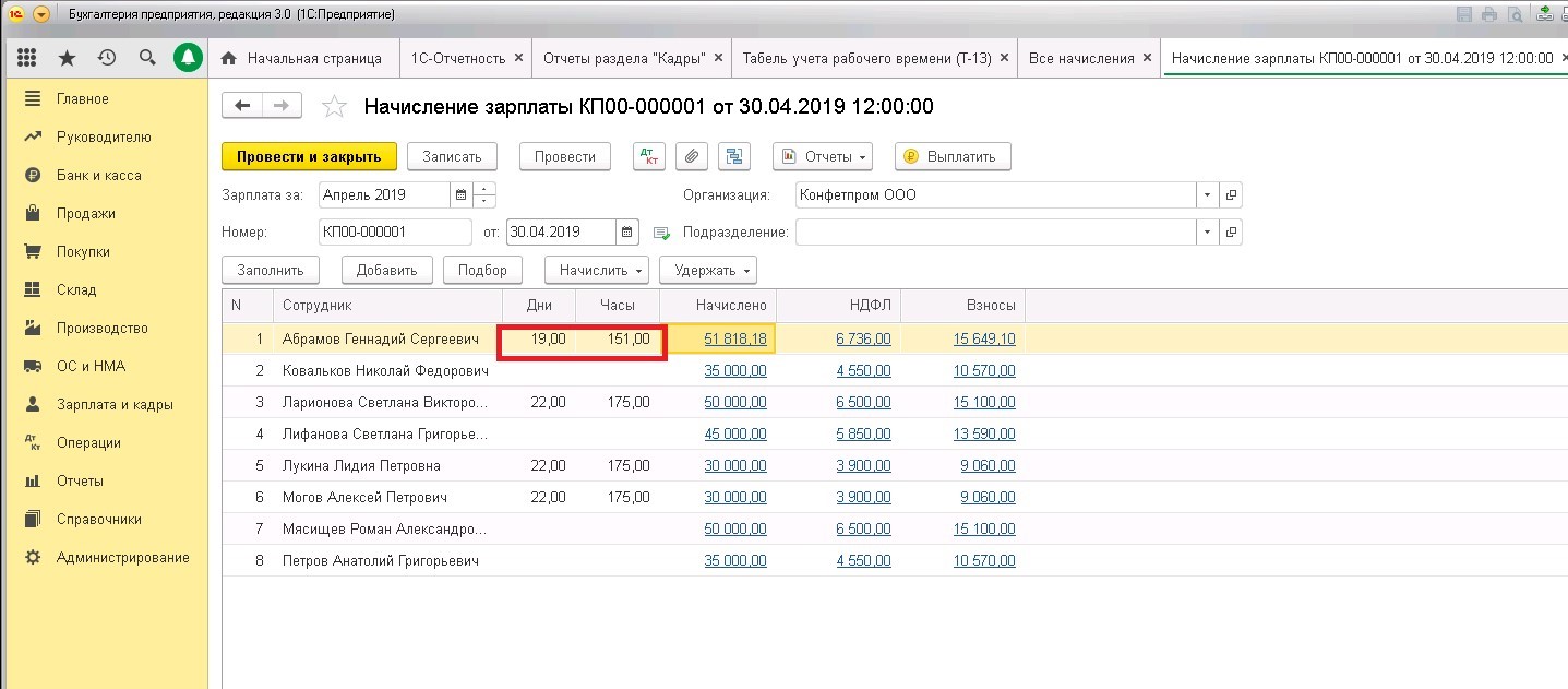 Данный вид отпуска обязательно повлияет и на расчет зарплаты за апрель. Автоматический расчет показал, что из 22 рабочих дней сотрудник отработал всего 19.