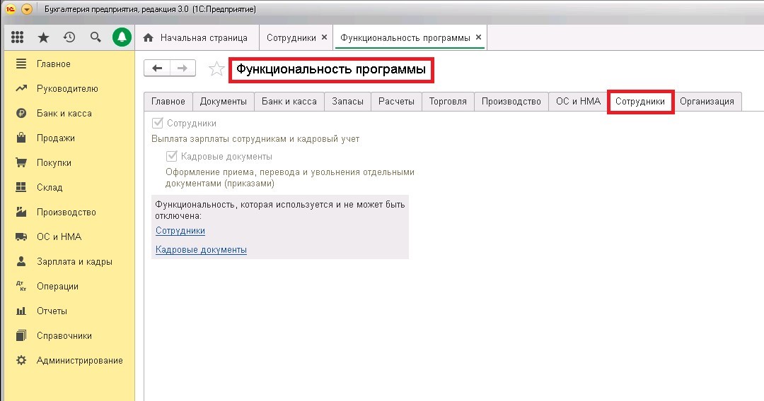 На верхней панели необходимо перейти на вкладку «Сотрудники» и установить пометку в виде галочки на «Кадровые документы».