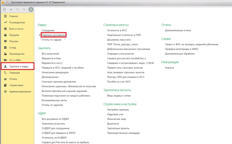 При включенном режиме функциональности нужно последовательно перейти в пункты «Зарплата и кадры» - «Кадровые документы».