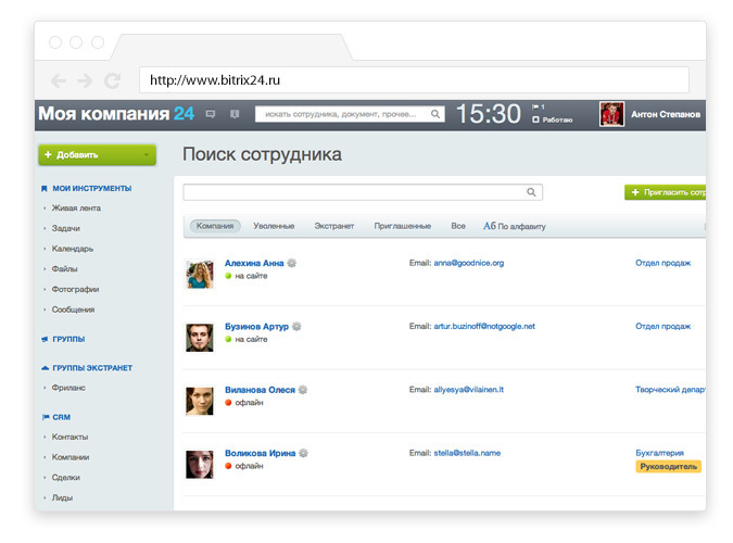 « Мы выступаем партнёрами „ Битрикс24“ с февраля 2012 года. До этого момента мы использовали qTrack. На сервере всё довольно удобно, есть большой список различных инструментов. Помимо стандартных возможностей, имеется учёт рабочего времени: можно смотреть, кто из сотрудников сколько времени тратит на работу и кто что сделал. Есть таблица работников, по которой можно составлять отчёты. Доступна функция ведения графика отсутствия на рабочем месте. Для всех участников проекта составляется календарь важных событий — например, совещаний и планёрок. Можно вести учёт клиентов, добавлять без создания аккаунта, если их присутствие необходимо».