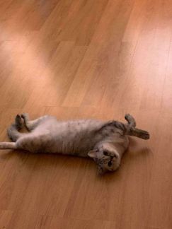 Denis, если приходят до 3-4 человек, он убегает под ванну, но если его не доставать, не беспокоить, спокойно сидеть общаться, у него любопытство перевешивает, он начинает потихоньку выходить и исследовать пространство, обнюхивать людей. Тут главное его не пугать.