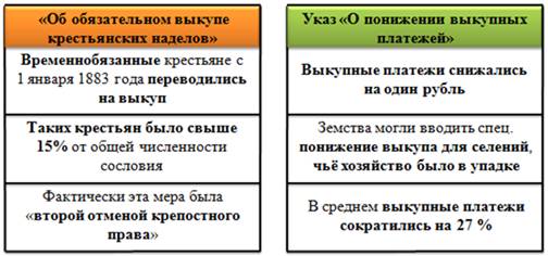 - положение о повсеместном снижении выкупных платежей на 1 рубль. Позже было выделено 5 млн рублей на их дополнительное снижение в некоторых губерниях.