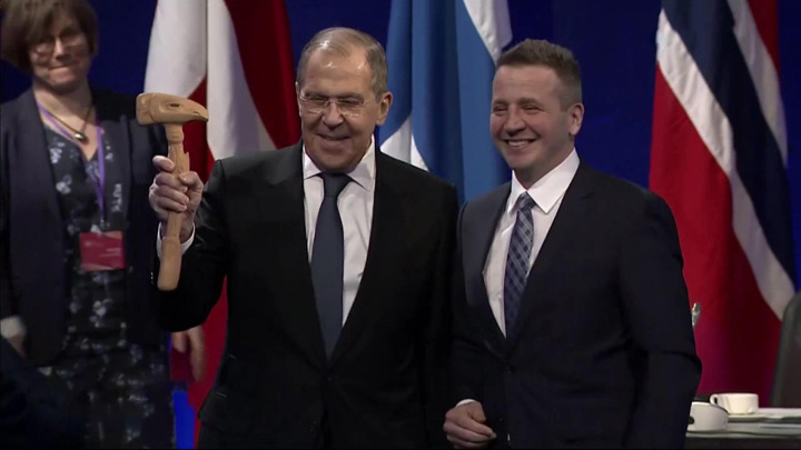 Гуманитарную повестку в Арктике Россия теперь будет продвигать с позиции председателя Совета. Уже подготовлена 10-летняя программа развития региона. Регалию руководителя – деревянный молот – Сергей Лавров получает из рук исландского коллеги Тора Тордассона. Молот Тора теперь у России. На два года.