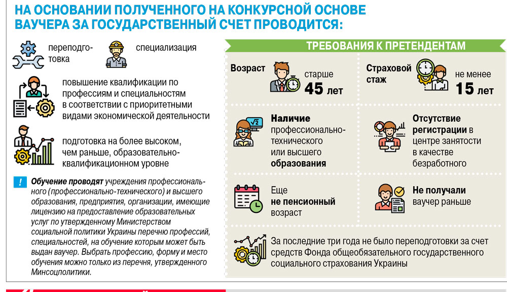 В Государственной службе занятости предлагают помощь 45-летним в виде переобучения или усовершенствования своей квалификации. Для этого можно попытаться получить специальный ваучер, который дает право бесплатного обучения /переобучения 53 профессиям в строго определенных учреждениях и организациях. Стоимость ваучера равна стоимости конкретного обучения, но она не может превышать 10 прожиточных минимумов для трудоспособного населения. На сегодняшний день эта максимальная сумма составляет 19210 грн. Начиная с 2013 года, когда начали выдавать эти ваучеры, в среднем в каждой области страны их получили по 1 тыс. человек. А в целом ваучеры получили где-то 25 тыс. людей в возрасте от 45 лет.