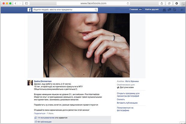 В ленте друзей на Facebook то и дело появляются посты о поиске работы, а также новых клиентов для фрилансеров. Они не похожи на типичные резюме: иногда это эмоциональные признания в любви к работе, красочные рассказы о профессиональных победах или грустные истории увольнения. Такие посты часто собирают много лайков и комментариев от сочувствующих. The Village решил разобраться, насколько они действительно помогают обрести новый источник заработка. Мы выбрали несколько нестандартных объявлений, связались с их авторами и узнали, как у них идут дела.