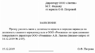 В место настоящей занятости руководству вручается письмо от компании, намеревающейся принять его сотрудника, и заявление от самого работника о его желании уволиться переходом на новое место (ст. 84 ТК РФ). В заявлении указывается:
