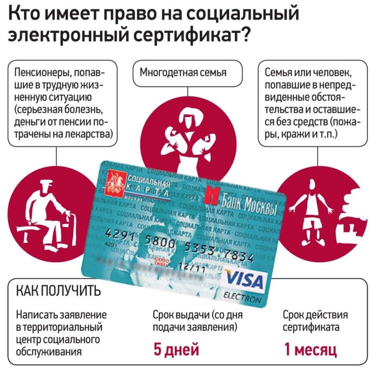Электронный социальный сертификат является одним из видов адресной помощи жителям столицы. В Москве, согласно с постановлением правительства столицы № 351-ПП от 19 июня 2014 года, нуждающимся гражданам выделяется помощь в виде денежных пособий, продуктовых наборов, необходимых товаров длительного пользования, детских товаров, медицинских изделий. Все виды предоставляются по заявлению граждан в зависимости от конкретных жизненных ситуаций.
