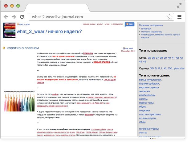 На удивление активное сообщество в «Живом журнале», где можно купить или продать неподошедшие вещи. Как и везде, явный перевес здесь наблюдается в пользу женской одежды, обуви и аксессуаров, периодически всплывают и мужские предметы гардероба, но их здесь явное меньшинство.