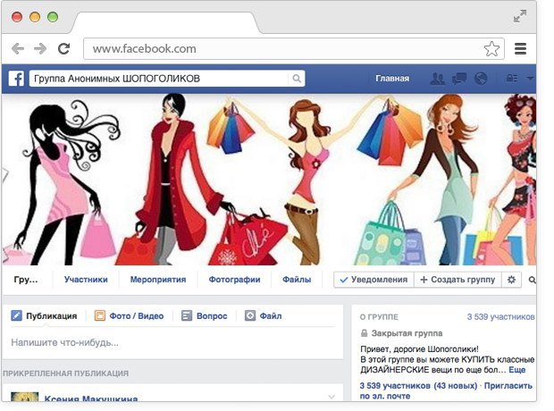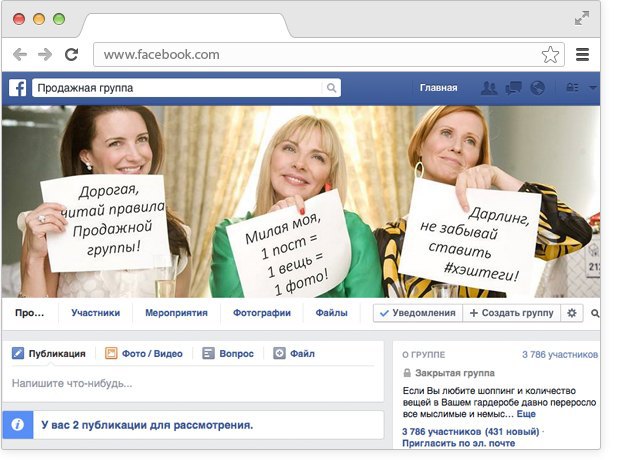 Закрытая группа в Facebook, вступить в которую, впрочем, может любой желающий; одобрение заявки — это лишь один из способов отсечь рекламу. Практически 95 % выставленных на продажу вещей — женская одежда, обувь и аксессуары. Периодически попадаются одинокие мужские костюмы или кроссовки, а также техника и ещё более редкие товары для дома.