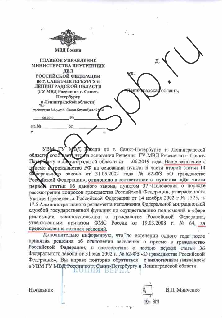 - отклонение заявления (п. д ч. 1 ст. 16 ФЗ №62 «О гражданстве») или отмену решения о приеме в гражданство (ч. 1 ст. 22 ФЗ №62 «О гражданстве»)