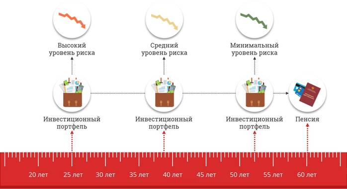 Вначале, когда до пенсии остаётся 20-30 лет, риск портфеля, а значит, и его потенциальная доходность могут быть выше. Но со временем, по мере приближения пенсионного возраста, рискованность вложений должна снижаться. Когда до выхода на пенсию остаётся всего 1-2 года, инвестиционный риск должен быть минимальным.
