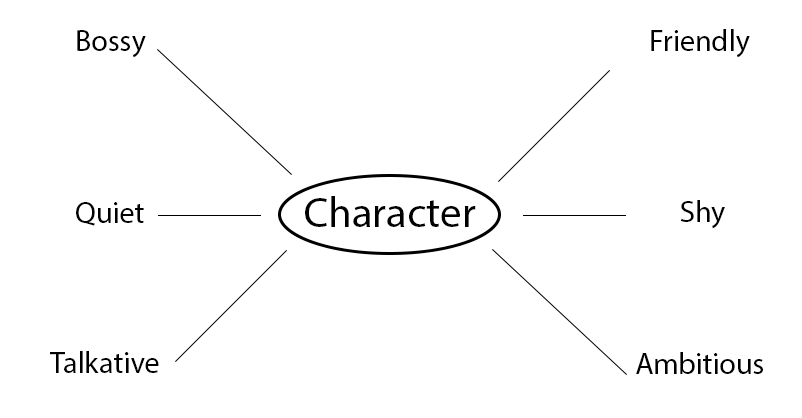 - Упорядочиваем новую лексику по темам. Хороший и наглядный способ — составить так называемую spidergram, схему, похожую на паучка. Помещаем в центр, допустим, слово «character» — и тянем от него «лапки» к нужным прилагательным. Можно сплести и развесистую «паутину», если разделить слова по более узким категориям.