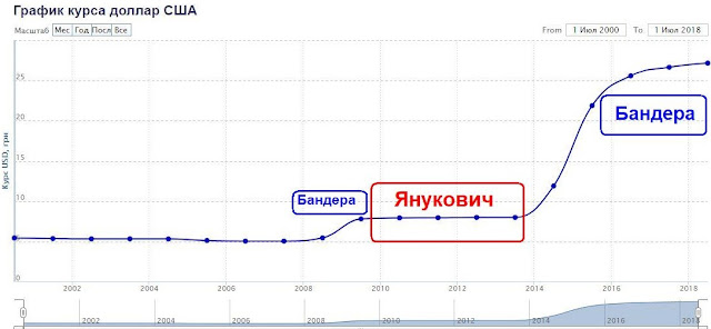 При Януковиче за 4 года гривна выросла на 15% относительно рубля и стоила 4 рубля, а сейчас 2, то есть, при бандерах упала вдвое!