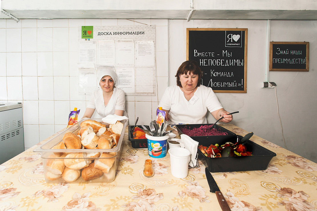 Заира со стажерами первая отправляется на обед — в 12 часов. В это время начинают кормить работников, заступивших на смену в 8 утра. Следующими пойдут те, кто работает с 9, — и так далее. Еда простая: макароны, гречка, котлеты, винегрет, салат из помидоров и огурцов, куриная лапша, компот, булочки, фрукты. Делятся всем и со всеми, в добавке никому не отказывают, а все супы и салаты от души заправляют майонезом из полукилограммовых пачек — за день уходит одна, а то и больше.