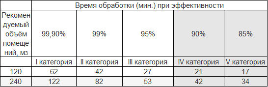 Помещения делятся на категории, например, наши основные клиенты - школы, большинство классов и общих пространств там - это 4 категория помещений. Для 4 категории помещений не требуется обработка 99,9% эффективности, как в операционных, а согласно документам Минздрава, только 90%. А для 5 категории и вовсе 85%. Поэтому и время очистки снижается, а значит за час можно очистить объём помещения больше, чем мы описывали в примере выше. Разница ощутима и её можно наблюдать в таблице ниже на примере рециркулятора с производительностью 120 куб.м. в час: