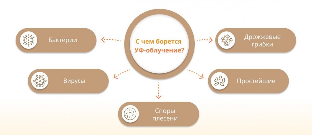 Ультрафиолетовые лучи способны как убивать микроорганизмы напрямую, так и воздействовать на их ДНК, лишая способности к размножению. Наиболее чувствительны к ультрафиолету вирусы и бактерии в вегетативной форме (палочки, кокки). Меньше реагируют