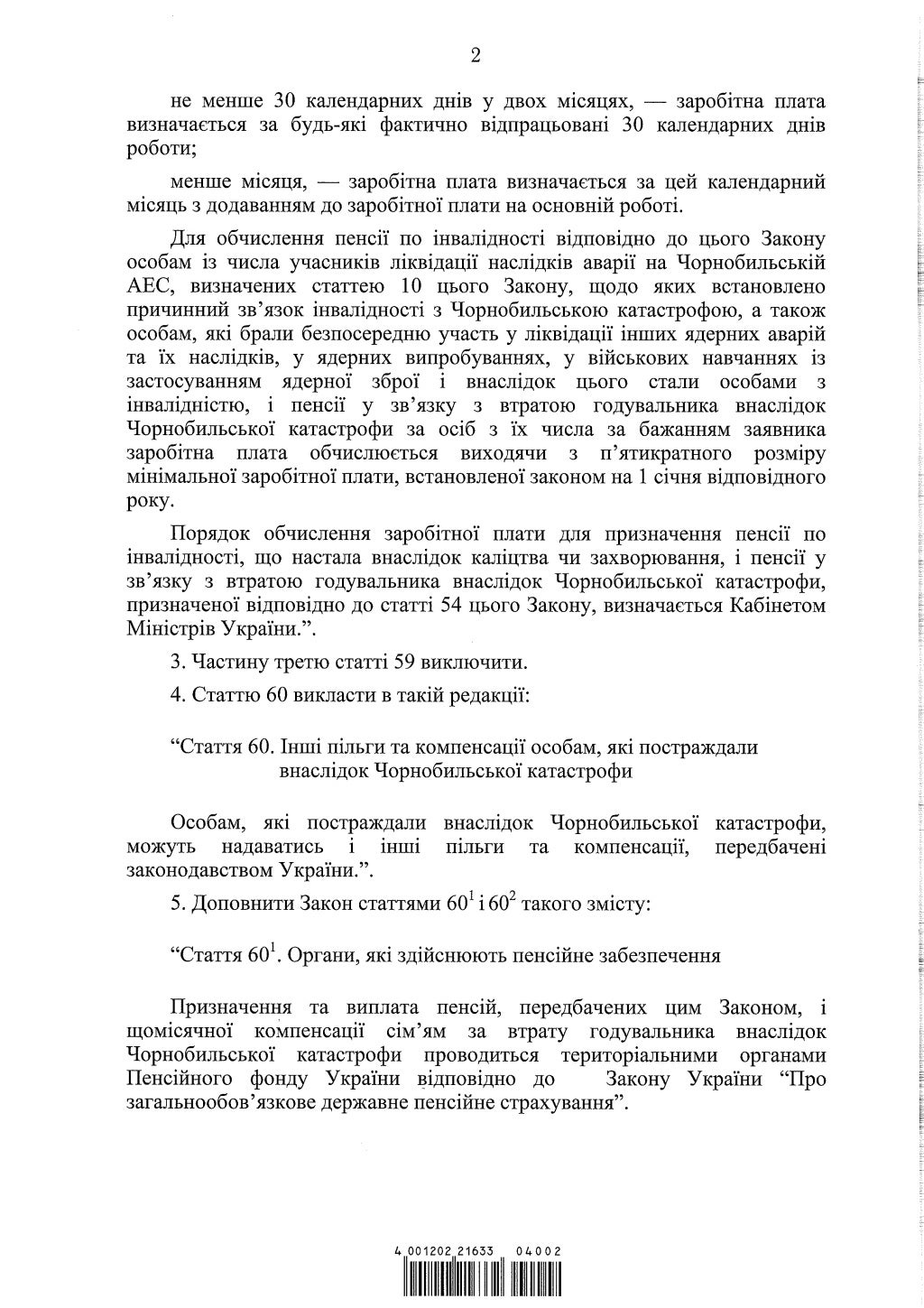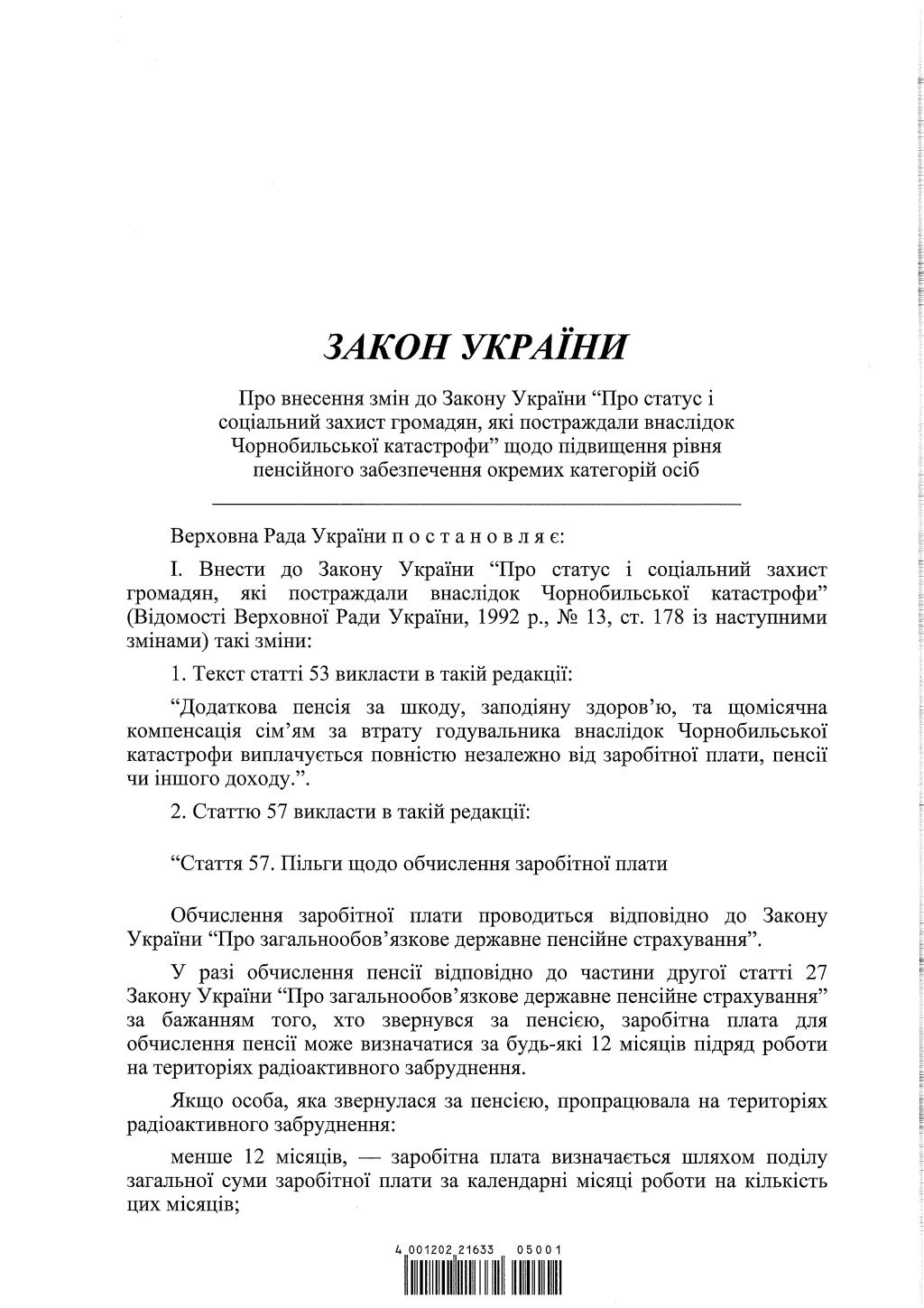 Тем, кто работал в зоне отчуждения не меньше 14 дней на протяжении 1987 г., пенсионный возраст снижается на 8 лет. На 5 лет сокращен пенсионный возраст для тех, кто работал на ЧАЭС с 1 июля 1986 по 31 декабря 1986 г. меньше 5 дней, и не меньше 30 дней – в 1988 г., а также тех, кто трудился на действующих пунктах санитарной обработки населения и дезактивации техники или их строительстве не меньше 14 календарных дней в 1986 г.