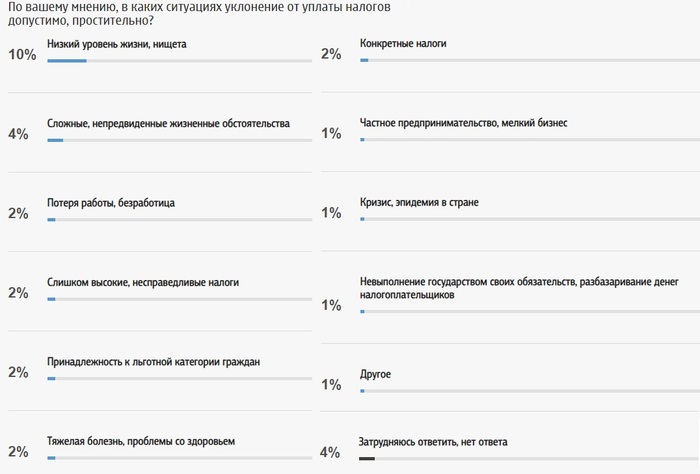 Уклонение от налогов считают допустимым в отдельных ситуациях 64% респондентов, 27% опрошенных считают, что уходить от уплаты налогов нельзя ни при каких условиях.