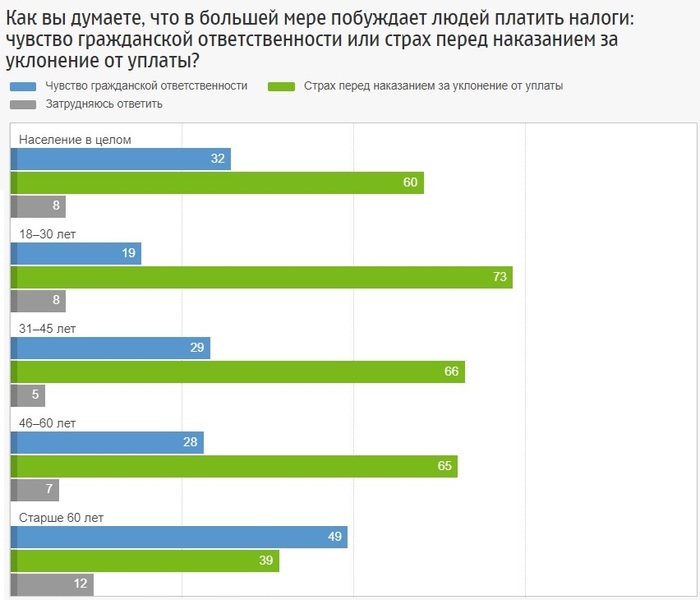 На вопрос о причинах побуждающей граждан платить налоги, большинство респондентов (60%) назвали - страх перед наказанием за уклонение от уплаты, 32% - чувство гражданской ответственности.