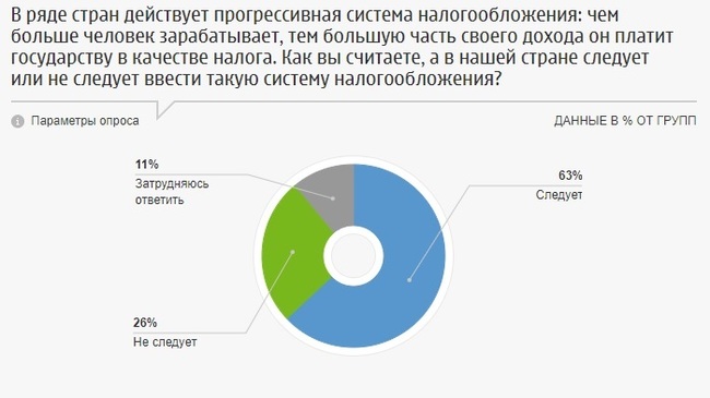 Среди сторонников прогрессивной шкалы 25% считают, что богатые должны платить больше налогов, 19% - что она поможет сгладить социальное неравенство, 7% объяснили, что в результате в бюджет будет поступать больше налогов и государство сможет больше тратить на социальные нужды.