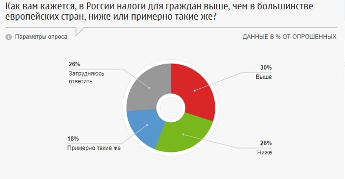 30% опрошенных считают, что в России налоги выше, чем в большинстве стран Европы, 26% - что ниже, 18% - что примерно такие же.