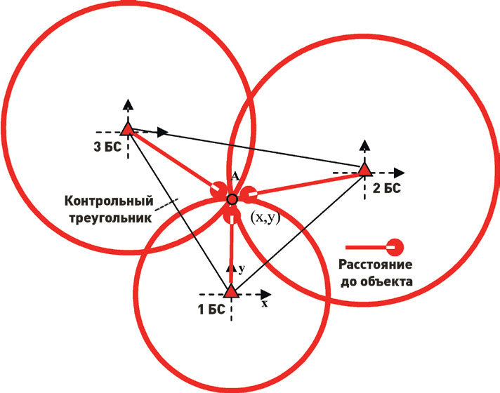 Каждая база знает расстояние до телефона до метра. Определяет по времени задержки сигнала до базовой вышки.