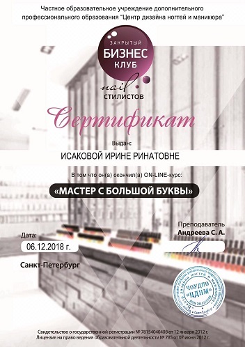 Я не считаю, что я в чем-то хуже тех, кто прошел курсы и получил заветные «корочки». Я также слежу за новинками, работаю в разных техниках, слежу за чистотой рабочего места и в курсе последних тенденций.