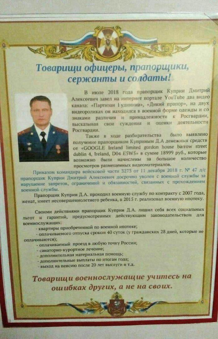 — После моего увольнения в войсках Росгвардии распространили агитационную листовку в мой адрес, где предупреждают других военнослужащих не повторять моих «ошибок», — возмущён Куприн. — Текст листовки я выложил на видео. Больше всего меня огорчило, что человек, составляющий эту листовку, даже не удосужился проверить информацию о том, что у меня двое несовершеннолетних детей, а не один, как там указано. А вместо названия канала «Партизан Грудинина» написали «Партизан Гудинина» — то ли опечатались, то ли боятся называть даже фамилию.