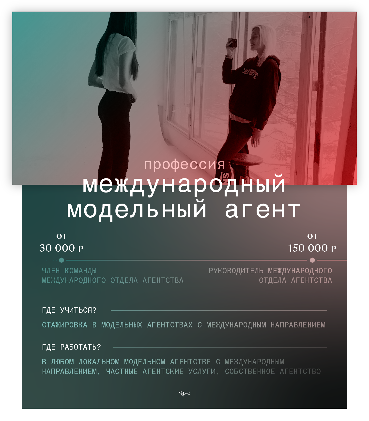 Вскоре из агентства уволился международный агент — человек, который отправляет моделей работать за границу. Я пришла к нашим менеджерам и сказала, что мне было бы интересно поработать в этом качестве. Из навыков у меня был только английский язык и неплохая насмотренность, но, видимо, руководство решило, что я справлюсь, и меня взяли стажироваться.