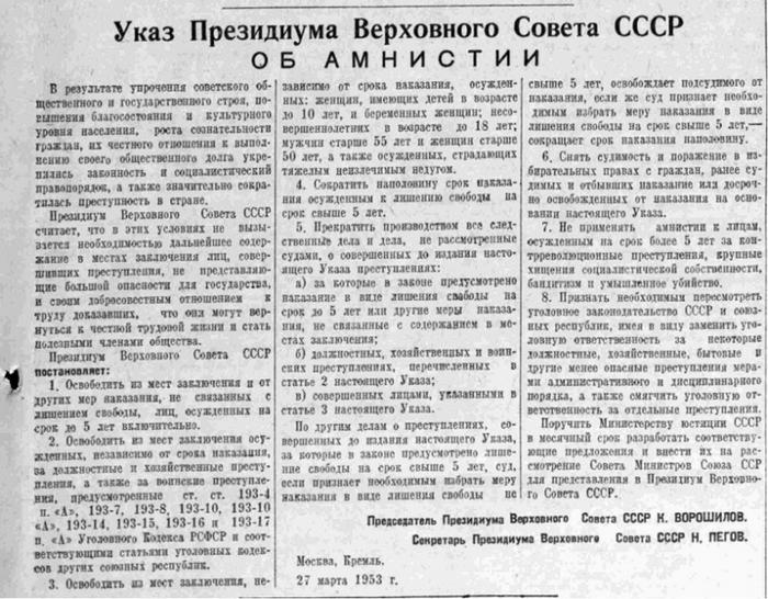 На следующий день после получения записки Берии, 27 марта 1953 года, Президиум Верховного Совета СССР принял Указ «Об амнистии» всех заключённых, чей срок не превышал 5 лет, а также уменьшении в два раза сроков других заключенных, кроме осуждённых на 10-25 лет за бандитизм, умышленное убийство, за контрреволюционные преступления и за хищения социалистической собственности в особо крупных размерах. В первую очередь из мест заключения освобождались беременные женщины и имеющие малолетних детей, несовершеннолетние, старики и инвалиды. К иностранцам амнистия применялась на общих основаниях.
